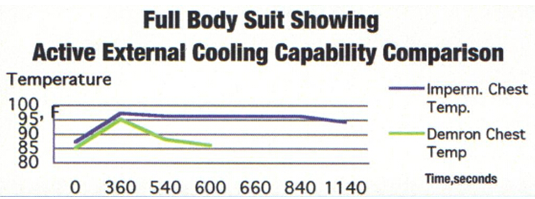 實驗條件:工作人員身穿不同防護(hù)服,以3.5英里/小時的速度在跑步機(jī)上慢跑10分鐘后測量全身防護(hù)服的溫度。藍(lán)色曲線代表通用防護(hù)服,綠色曲線代表使用Demron材料制成的防護(hù)服。
