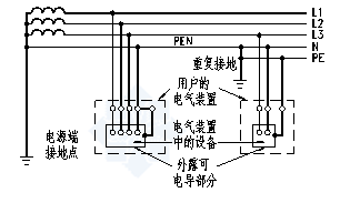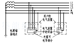 電源端有一點直接接地,電氣裝置的外露可電導部分直接接地,此接地點在電氣上獨立于電源端的接地點(見圖1-4)。