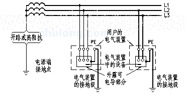 電源端的帶電部分不接地或有一點通過高阻抗接地,電氣裝置的外露可電導部分直接接地(見圖1-5)。